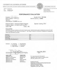 图:加州大学河滨分校语言课程成绩单