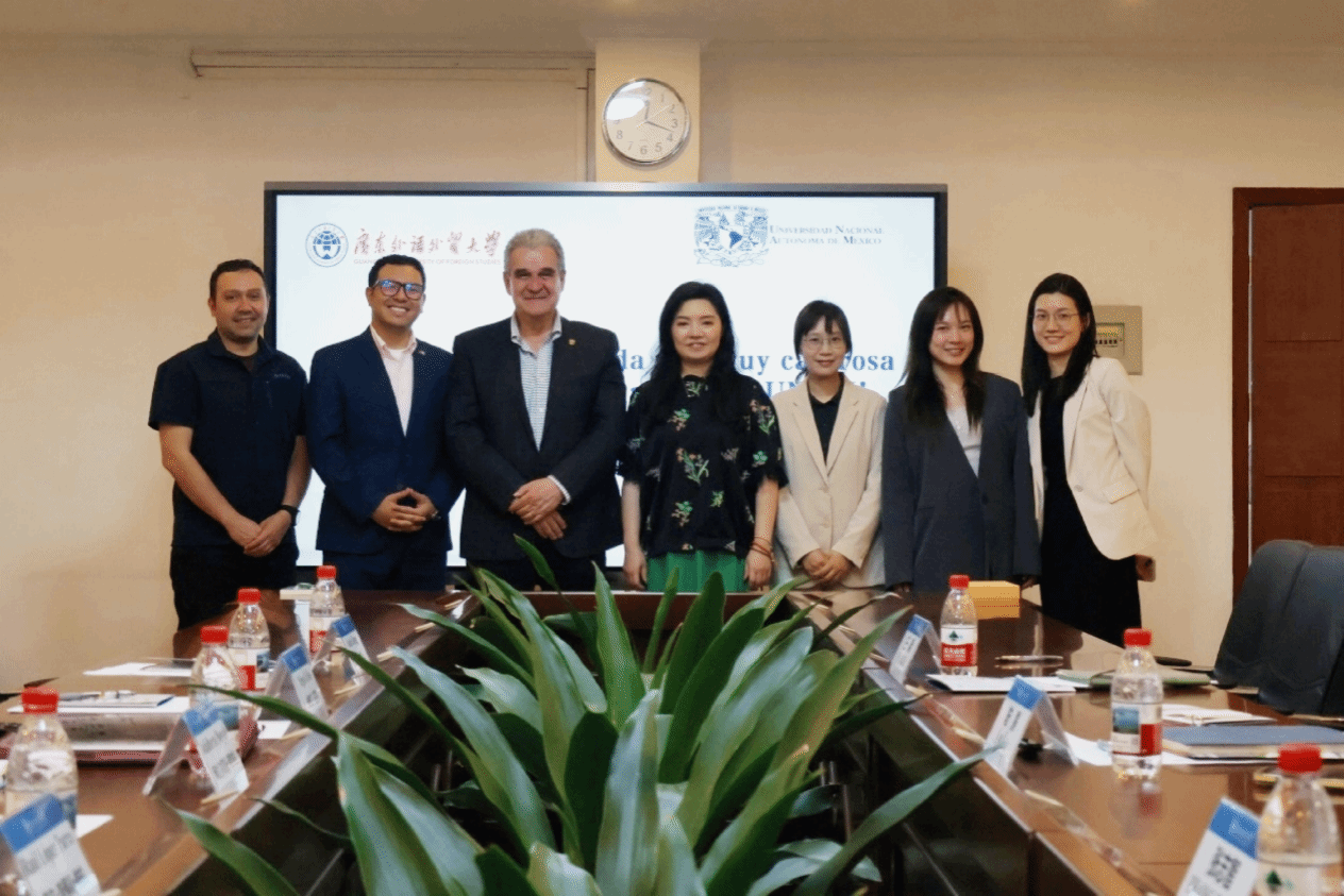 本网讯 4 月 14 日,墨西哥国立自治大学驻华代表处主任阿达尔贝托・诺约拉、传播与推广事务专员劳尔・洛佩斯・帕拉一行来访我校。墨西哥驻广州总领事馆领事米格尔・乌里韦、总领事助理邓思婧陪同到访。我校国际交流合作部副部长(主持工作)陆露在白云山校区与来宾座谈交流,国际交流合作部及西方语言文化学院相关人员参加会议。
