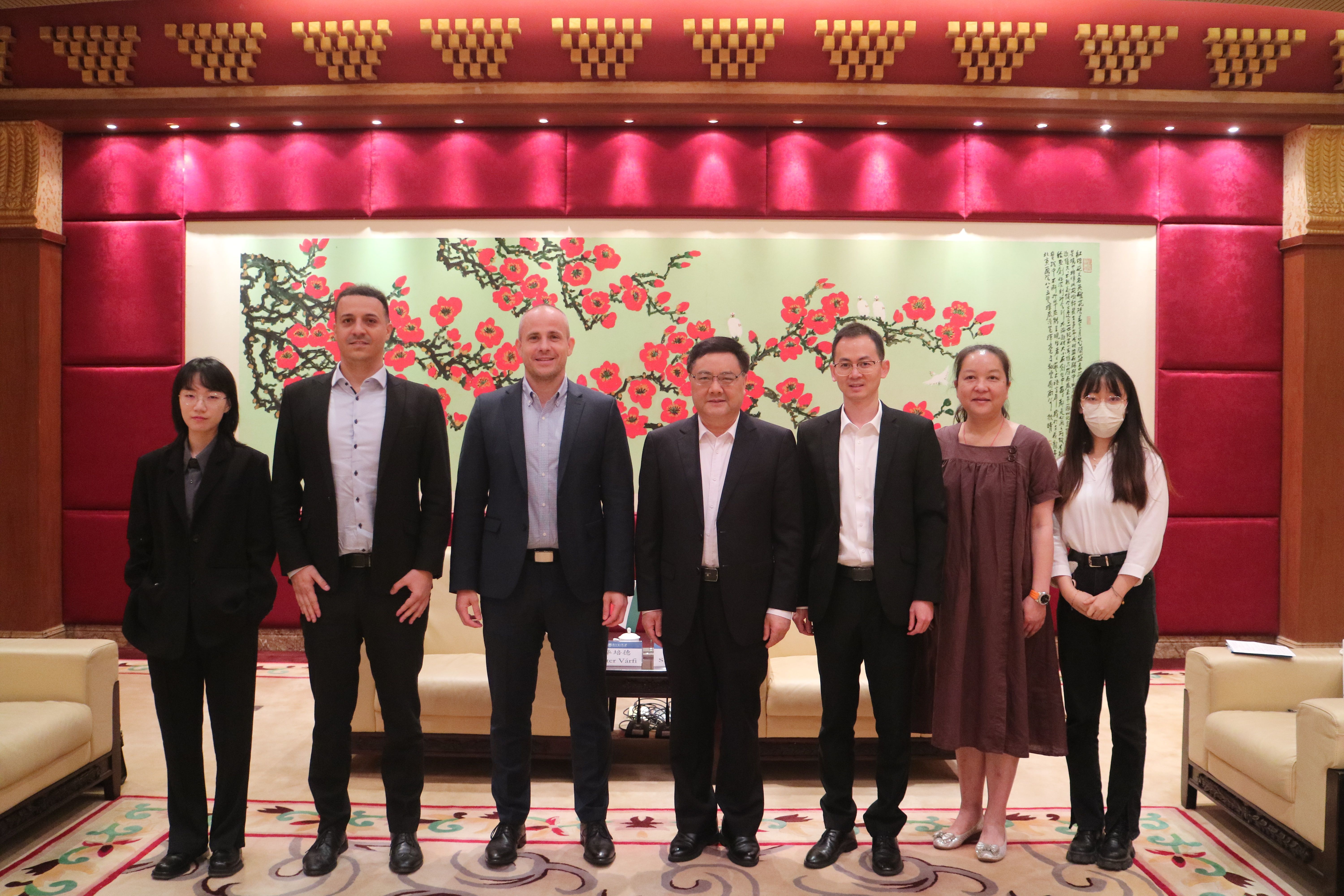 石佑启对华培德一行的来访表示欢迎,并向其介绍了我校的教学现状、办学特色和匈牙利语专业建设等。他表示,中匈友谊深厚,随着两国在经贸、教育等领域的合作逐渐深入,匈牙利语人才需求量将大大增加。学校于2023年新增匈牙利语专业,旨在培养“匈牙利语+英语”复合创新型双语人才。学校高度重视与匈牙利高校的合作,已与匈牙利佩奇大学签署校际合作协议。希望总领事此次来访,为学校和匈牙利高校在各领域的交流提供强大推动力,共拓合作领域。