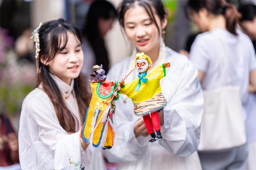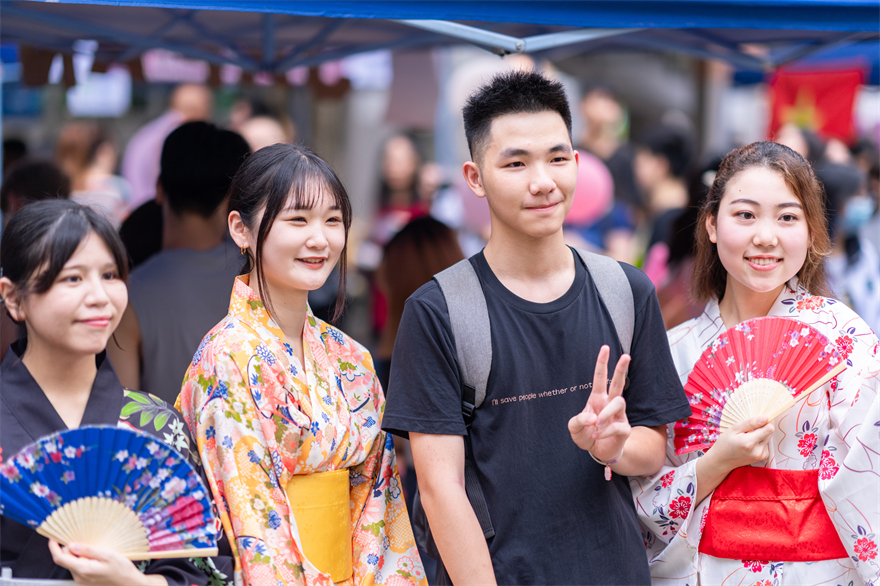 代表中国文化的东道主摊位别出心裁。来自中文学院的“越古食肆”与来自艺术学院的“偶具匠心”,携中华美食文化与高州“非遗”木偶戏文化来到“世界”舞台,向世界讲好中国故事。“越古食肆”团队不仅准备了广东本土的特色点心——杏仁饼和钵仔糕,还为中外来客打造了《红楼梦》的菱粉糕制作体验活动,用各式各样的模具印刻出糕点文化之美。“偶具匠心”团队将“牛魔王”与“孙悟空”的比试较量小剧场带到摊位,将高州木偶戏的魅力展现给世界。艺术学院20级的陈同学表示:“在宣传非遗的过程中,我为我们的中华优秀传统文化感到骄傲。”