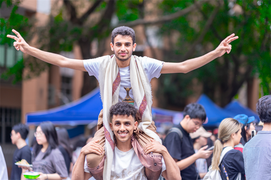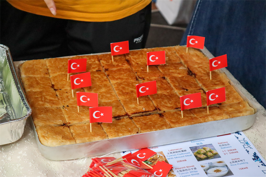 来自泰国的酸辣凉拌鸡肉沫小食,白俄罗斯细腻的土豆泥、越南香脆的春卷、韩国嚼劲十足的年糕、太平洋岛国的各式可口糕点、日本的大阪烧、土耳其的巴克拉瓦、乌兹别克斯坦的手抓饭、印度尼西亚的欢乐气泡水、埃及的阿拉伯咖啡、德国的啤酒、英国的奶茶、加拿大的肉汁薯条、巴西的清新鸡尾酒……丰盛佳肴、香醇迷人、琳琅满目。除了美食,各国摊位各显身手,向大家展示出独属于本国的特色风情。也门摊位上的传统建筑模型和韵味十足的手部彩绘体验引人注目;身穿埃塞尔比亚服饰的外国友人与学生们随着掌声、节奏激情舞动。每一声赞叹,每一个欢呼,每一次击掌,共同演奏出文化交流的蓬勃旋律。