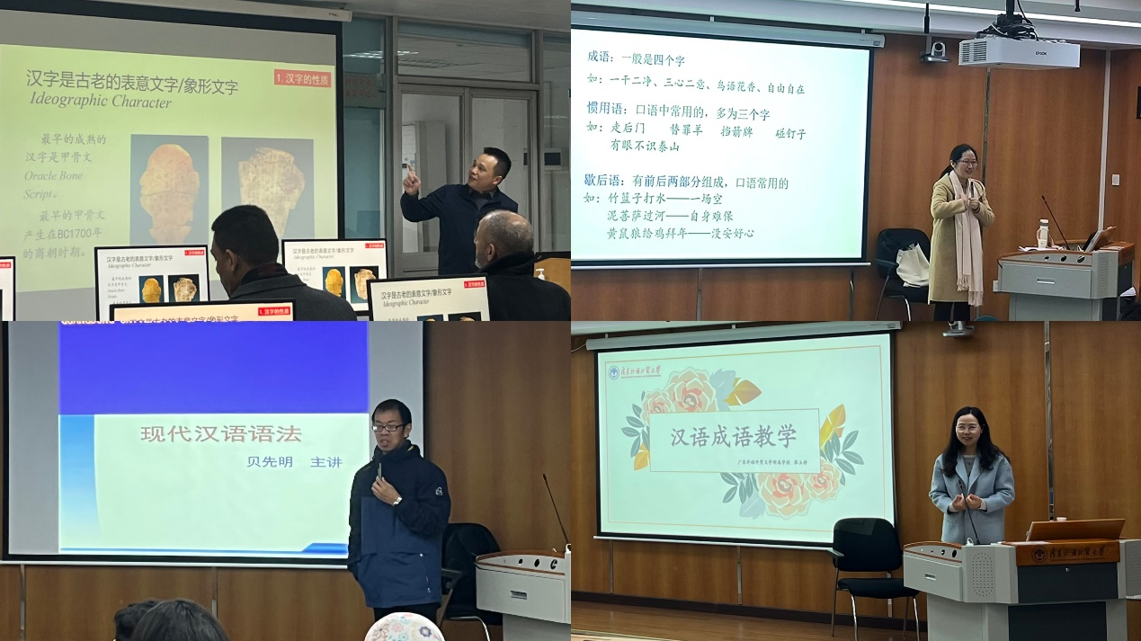 整个课程涵盖了语言要素教学、教学能力训练、中国文化体验与调研、专题讲座四大模块。语言要素教学模块包括《融合信息技术的汉字教学》(魏慧斌)、《汉语二语词汇教学》(丁沾沾)、《汉语语法教学》(贝先明)、《汉语成语教学》(张玉静),旨在提升学员的听、说、读、写综合语言能力,并注重语言要素的科学性、准确性,以及在教学中的灵活编排和诠释。教学能力训练模块包括《汉语语音与教师口语》(林晴)、《国际中文教学设计》(彭淑莉)、《岭南文化及其教学》(邱春安)、《语言测试理论与实践》(陈子骄),旨在提升学员的普通话发音、口语教学、文化教学和教学设计技能,以增强其中文教学水平。专题讲座《中国文化的和平性》(严修鸿)以儒家核心理念为起点,讲述了中国古代“和亲”外交与当代“和平共处、互利共赢”政策,帮助学生领悟中国文化中的和平智慧和价值观。《人工智能时代的国际中文教学》深入介绍了王治敏教授及其团队利用自然语言处理技术和移动互联技术构建的国际汉语教学核心资源与智慧教育平台。