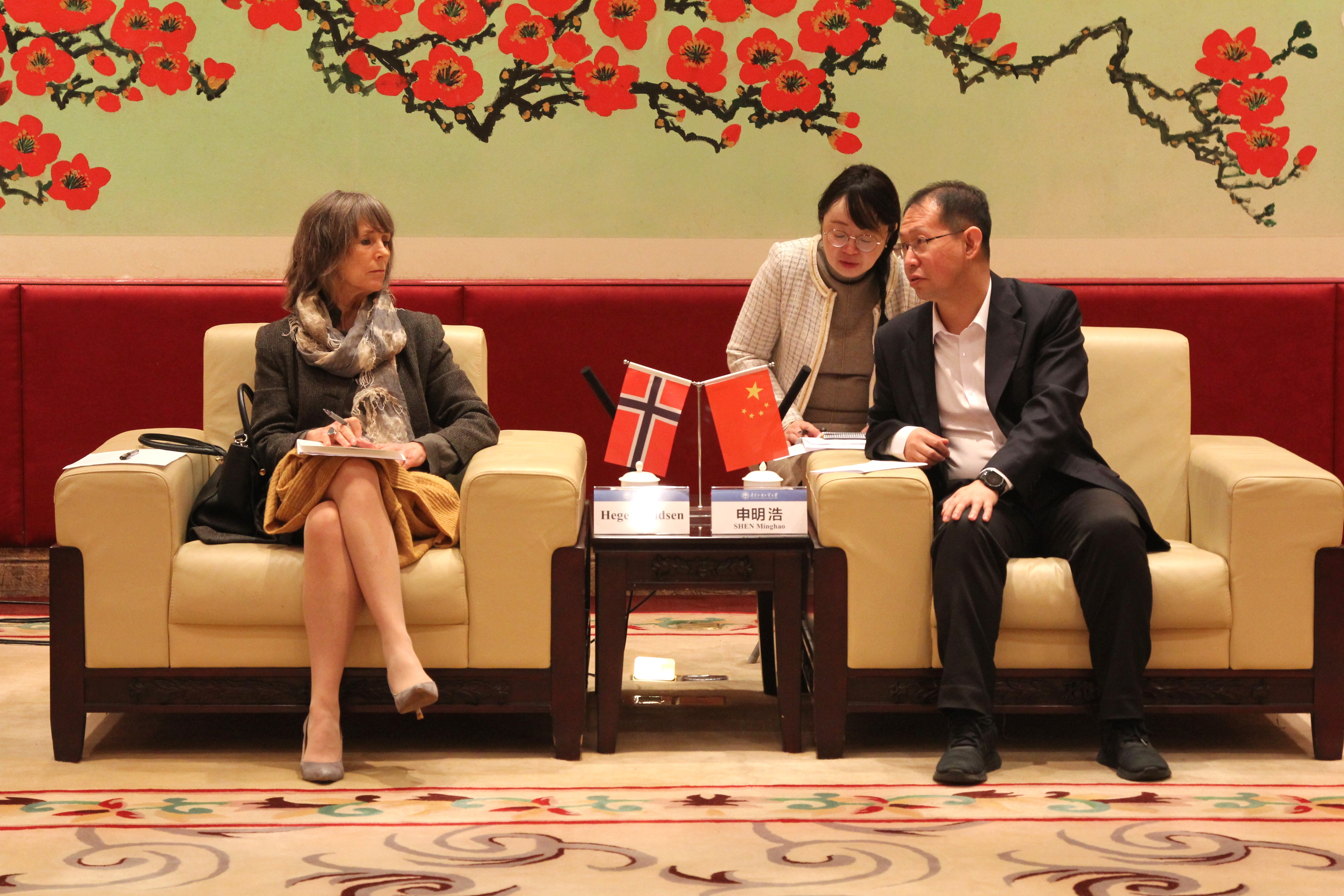 申明浩首先对海歌总领事一行的来访表示热烈的欢迎,并详细介绍了我校在国际化人才培养等方面的卓越成就。他指出,我校作为华南地区国际化人才培养、外国语言文学、全球经济治理、涉外法治研究及中华文化国际传播的重要基地,充分利用多语种学科优势,积极探索、创新人才培养模式,以多语种、多学科交叉专业为特色,培养具备国际视野的复合型人才。申明浩强调,我校与奥斯陆大学等挪威高校在国际化人才培养和学科建设方面有诸多共通之处,期待未来进一步拓展与挪威高校和研究机构的合作,共同搭建两国高校间友好交流的平台,为推动中挪人文教育事业的发展贡献更大的力量。