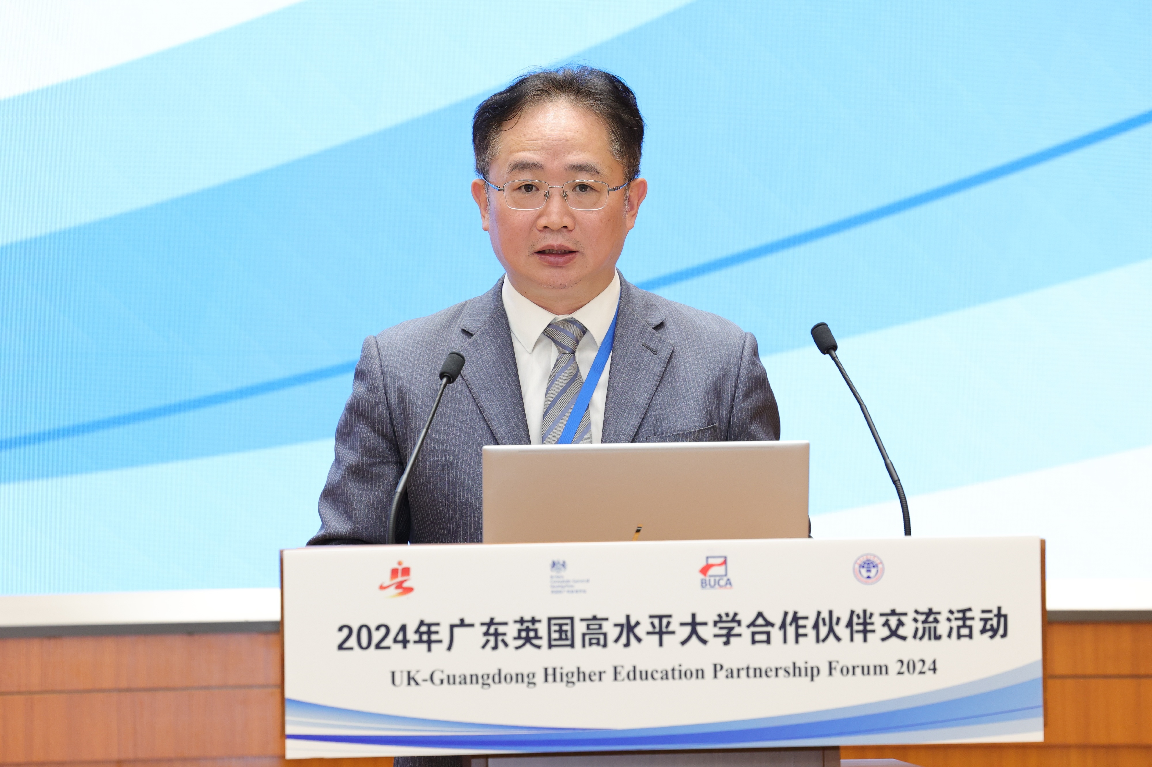 省教育厅交流合作处处长李金俊代表主办方广东省教育厅致辞。他回顾了中英两国在教育合作方面取得的丰硕成果,并指出在当前复杂多变的国际形势下,加强教育合作与政策沟通具有更加重要的意义。广东省教育厅将响应国家关于加强中欧人文交流的号召,推动广东与英国高校深入合作,共同培养更多具有国际视野的优秀人才。他深入解读了广东省教育的基本情况和对外开放政策,强调广东省将积极响应“一带一路”倡议,与世界各国加强教育交流,打造“留学中国·学在广东”的品牌;实施“教育对外开放工程”,加快推进粤港澳大湾区国际教育示范区建设,深入参与全球教育治理,持续推进高水平教育对外交流合作,探索教育对外开放的广东品牌、广东模式。希望以此次活动为契机,促进中英高校实质性合作,为两国青年学生提供更多相互学习、共同成长的机会。