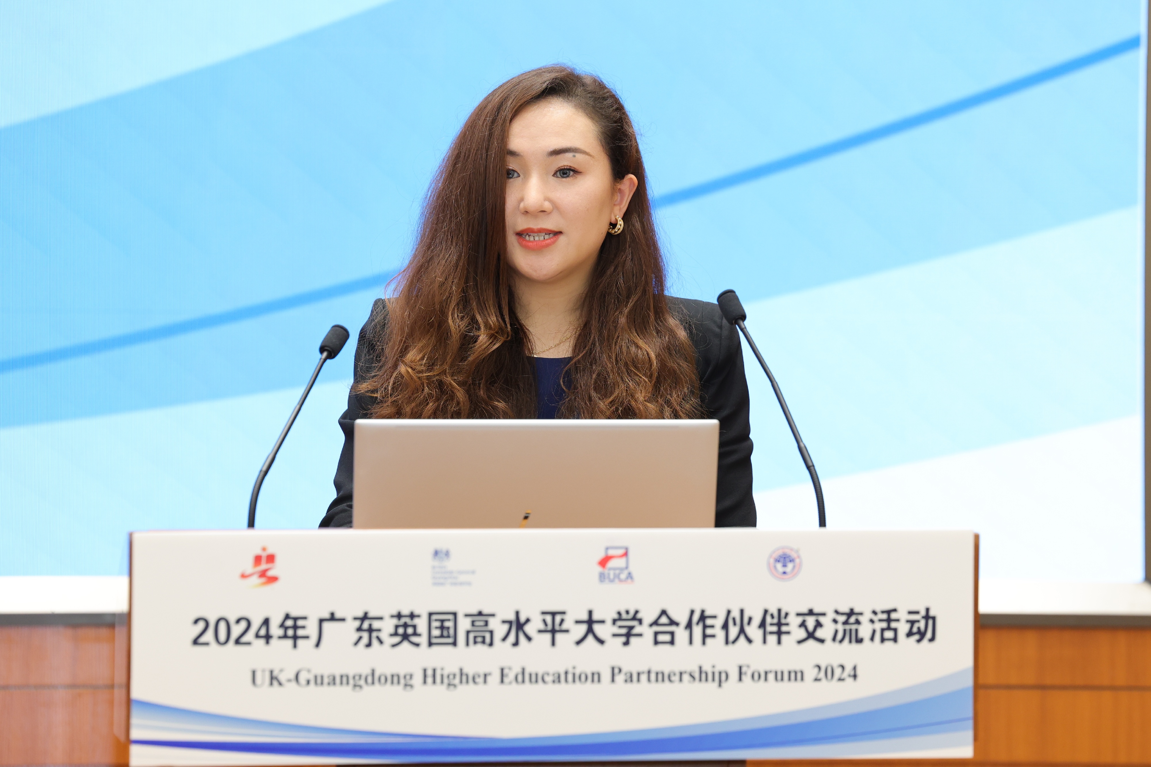 英国驻广州总领事孟诗然(Sarah Mann)在致辞中表达了对中英两国教育交流合作的期待。她表示,教育是链接不同文化、促进相互理解的桥梁,是英中关系的重要组成部分,本次活动的顺利召开为教育交流搭建了有益的平台。英中高等教育合作已在多领域开花结果,并具有广阔的前景。广东拥有独特的地理位置和开放的文化氛围,是国际教育交流中的重要窗口。她期待本次交流活动能够成为英中两国高等教育交流的新起点,助力未来教育合作达成新高度,为双方培养更多具有国际视野和竞争力的优秀人才。