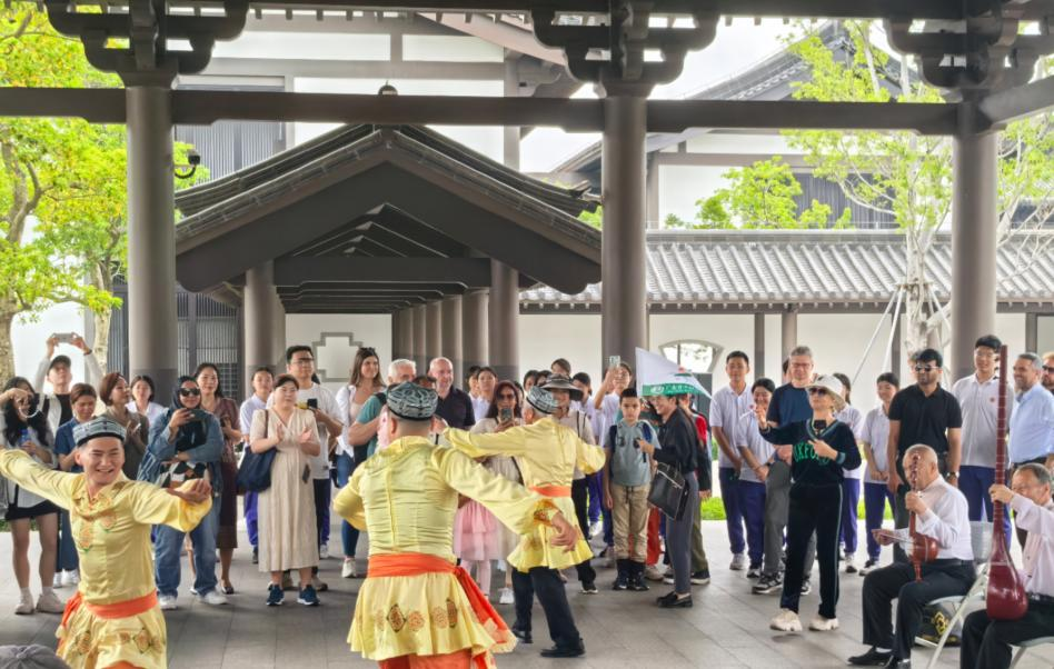 活动伊始,外教们一进入文化馆园区,便被热情奔放的新疆特色歌舞表演所吸引。舞者们身着鲜艳的民族服饰,伴随着欢快的音乐节奏,展现了浓郁的民族风情。外教们纷纷驻足欣赏,有的还情不自禁地跟着音乐节奏摇摆,现场气氛热烈。