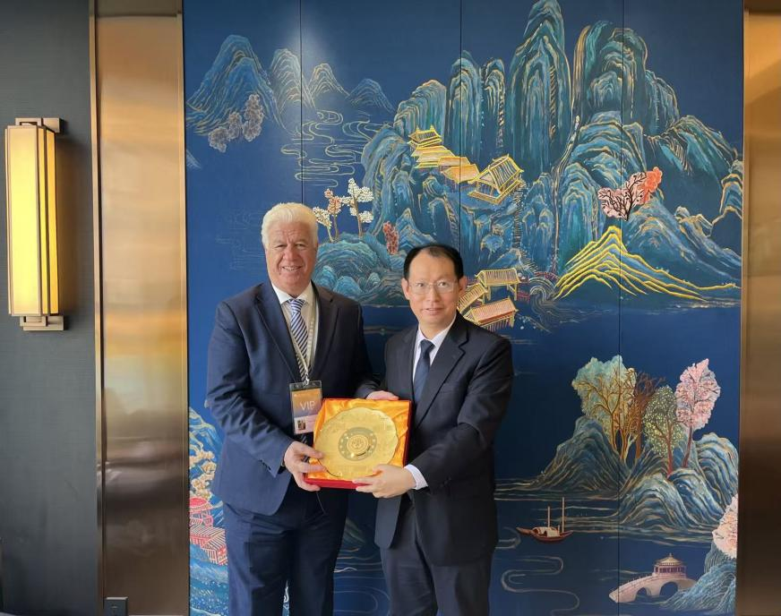 在京期间,申明浩会见了希腊爱奥尼亚省省长Ioannis Trepeklis一行。双方围绕推进中希语言文化交流、共建中文教育与文化交流中心等合作议题进行了富有成效的探讨。在世界中文大会期间,我校区域国别学院希腊语教师凌海慧为Ioannis Trepeklis与教育部怀进鹏部长的会见提供了专业翻译支持,充分展现了我校在多语种人才培养与跨文化服务方面的综合实力。