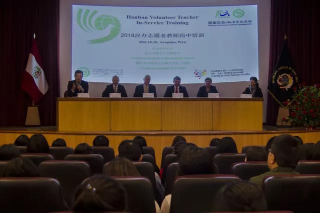 本网讯 当地时间5月18日至20日,来自秘鲁四所孔院及中学教学点的近50名志愿者教师参加了由国家汉办主办、孔子学院拉美中心和秘鲁圣玛利亚天主教大学孔子学院承办的2018年汉办志愿者老师岗中培训。岗中培训在圣玛利亚天主教大学米格尔.格劳礼堂开幕。秘鲁圣玛利亚天主教大学副校长凯撒.卡塞雷斯,孔子学院拉美中心主任罗伯特.拉封登、副主任孙新堂,圣玛利亚天主教大学孔子学院秘方院长安赫利卡、中方院长彭启贵,秘鲁皮乌拉大学孔子学院中方院长马征出席了开幕式。开幕式由孔院拉美中心副主任孙新堂主持。
