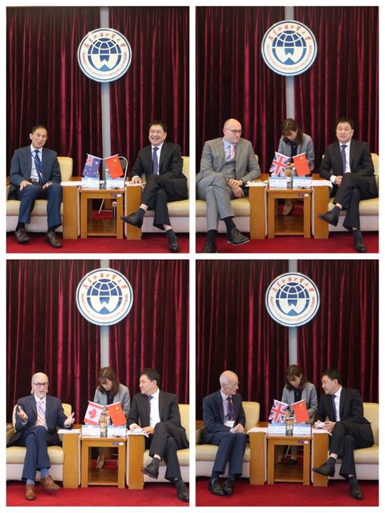 月18日,澳大利亚昆士兰大学、英国中央兰开夏大学、加拿大魁北克大学、英国格洛斯特大学代表团来访并出席第五届高等教育国际化国际研讨会。我校校党委书记隋广军、副校长陈林汉在北校区行政楼迎宾厅会见来宾,就双方合作等方面进行了交流。