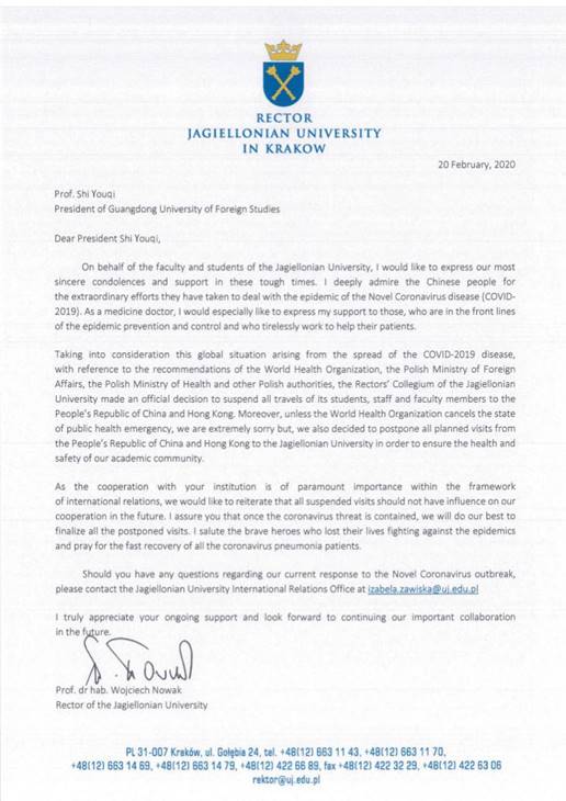 我校抗击新冠疫情到达白炽化时期,境外合作高校纷纷给予温馨慰问和大力支持。近日,波兰克拉科夫雅盖隆大学校长沃伊切赫·诺瓦克(Wojciech Nowak)教授向广外校长、党委副书记石佑启发来慰问函,高度赞扬中方在新冠肺炎抗疫期间所作的非凡努力,并对波方应对疫情的决策及与我校的未来合作计划等事项作出礼貌回应。