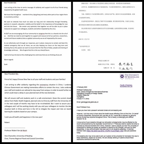 危难之时,见大爱。在抗击新型冠状病毒这场阻击战中,外国合作院校也表达了与我校师生并肩作战的情谊。日前,日本札幌大学孔子学院、昆士兰大学、英国雷丁大学及昆士兰科技大学先后发来慰问信,向我校表达高度关切之情和共克难关之意。