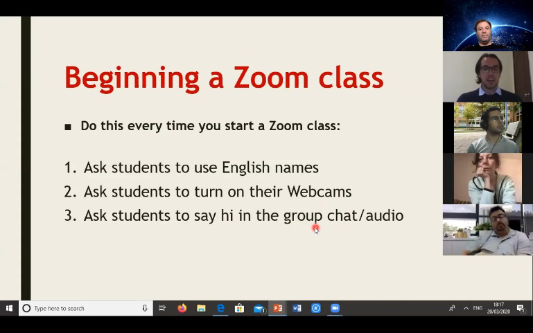 乔纳森坦言,虽然自己有着较为丰富的教学经验,但初入直播间,难免有些不适应。为达到良好的教学效果,在线上教学尚未正式开始时,秉着认真负责的态度,他积极寻求亲朋好友的帮助。在得知他的朋友Daniel(丹尼尔)熟悉Zoom的使用和操作后,他便邀请Daniel为广外身边的外教开设在线讲座,组织大家一同进行“头脑风暴”分享和讨论如何更好的使用Zoom平台,这为外教线上教学的顺利开展解决了技术难题,铺平了道路。