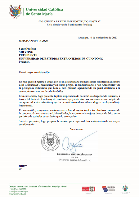 秘鲁圣玛利亚天主教大学校长发来贺信及祝贺视频