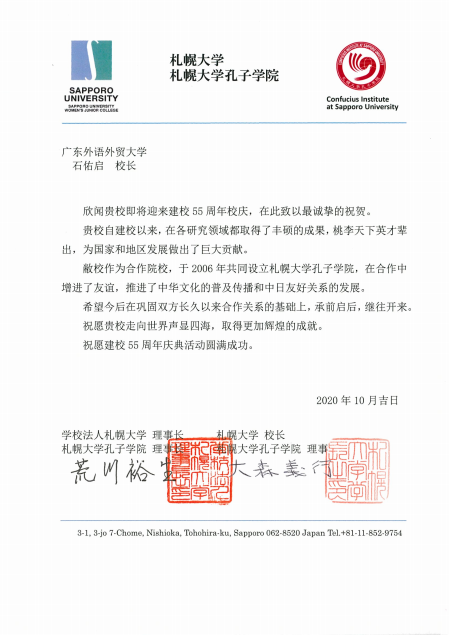 日本札幌大学理事长、孔子学院理事长荒川裕生、校长大森义行向我校专门发来中文贺信,表达了对我校55周年的祝贺以及两校过往多年合作的赞赏。俄罗斯乌拉尔联邦大学校长维克多·科克沙洛夫、副校长弗拉基米尔·科鲁扎耶夫、中外方院长及教职工专门录制了视频表达对我校55周年校庆的祝贺。