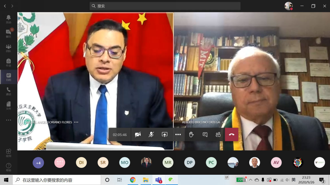 本网讯 9月27日晚上10点(秘鲁时间26日上午9点),我校与秘鲁圣玛利亚天主教大学在线上举行了圣玛利亚天主教大学孔子学院成立十一周年庆活动。我校副校长焦方太、秘鲁圣玛利亚天主教大学校长Dr. Manuel Briceño Ortega、副校长Dr. Jorge Luis Cáceres Arce、副校长Dr. Máximo Orlando Mario Rondón、副校长Dr. César Cáceres Zárate等出席活动。