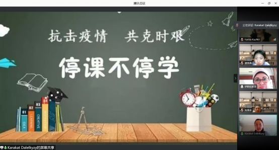研讨过程中,来自中国、哈萨克斯坦和埃及的骨干教师们依次发言,分享自己的教学心得。广外艾大孔子课堂的毛洁老师形象地介绍了字母辩读、声调连读课堂讲解过程中的注意事项,从语言教学、汉字教学和词汇教学三个方面分析了零基础对外汉语线上教学的难点,并提出了行之有效的解决方法。阿里法拉比哈萨克国立大学东方学系汉学教研室的柯拉热老师从历史发展、办学规模、师资力量、合作交流、课程设置、人才培养等多个角度出发,全面地介绍了学校的汉语教学情况。