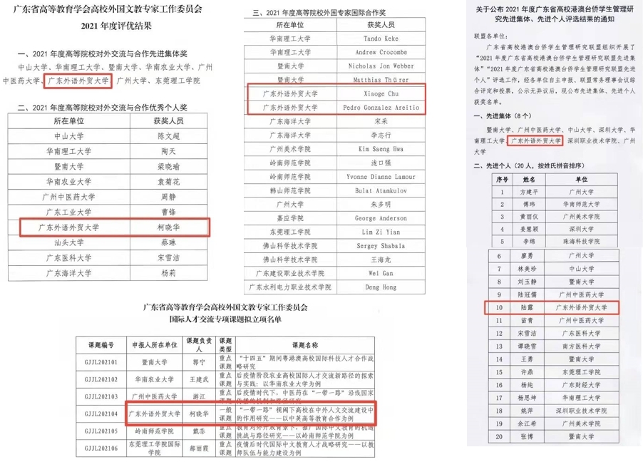 近日,我校国际暨港澳台合作交流等工作捷报频传。学校先后荣获“广东省2021年度高等院校对外交流与合作先进集体”及“2021年度广东省高校港澳台侨学生管理研究联盟先进集体”两个荣誉奖项。学校国际合作与交流处处长、港澳台事务办公室主任、孔子学院办公室主任柯晓华获2021年度高等院校对外交流与合作优秀个人奖,学校国际合作与交流处副处长、港澳台事务办公室副主任陆露获2021年度广东省高校港澳台侨学生管理研究先进个人奖,外籍教师Xiaoge Chu、Pedro Gonzalez Areitio获2021年度高等院校外国专家国际合作奖。在对外合作研究方面,柯晓华申报的“在‘一带一路’视阈下高校在中外人文交流建设中的作用研究——以中英高等教育合作为例”课题,获广东省外专委批准立项。
