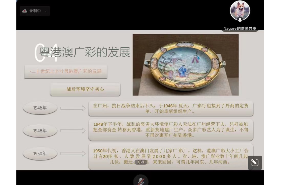 在湾区名师讲坛最后一场活动研习会上,各学生工作坊的代表做了精彩的分享。澳门科技大学学生黄允岑以生活中的具体实例结合历史文化,用西班牙语作主题为“澳门的街道和街牌历史发展”的分享。香港浸会大学学生马钰词从特色美食及套餐文化等方面展开介绍了香港的茶餐厅文化。我校学子岑嘉欣用中西双语介绍了凉茶的历史及制作方法、凉茶在粤港澳三地的发展传承等,李倩婷同学则向大家分享广彩技艺在粤港澳地区的过去与现在。在交流与学习中,粤港澳三地的师生们不断增加文化认知、文化认同,提升了用外语讲中国故事的能力,同学们皆表示对粤港澳大湾区的未来发展与建设充满希望,并积极参与其中。