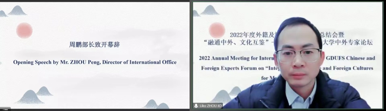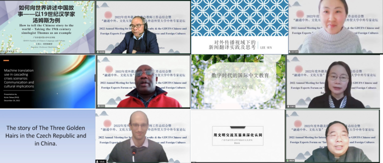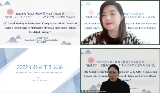 2022年12月29日下午,我校2022年外籍及港澳台教师年度工作总结会暨“融通中外、文化互鉴”——广东外语外贸大学中外专家论坛在线举行。本次活动由国际交流合作部、港澳台事务工作部(以下简称“国际部”)主办、中国语言文化学院协办。国际部部长周鹏为活动致开幕辞,国际部副部长陆露主持会议,全体外教、各单位外事负责人、国际部全体人员共95人出席了活动。