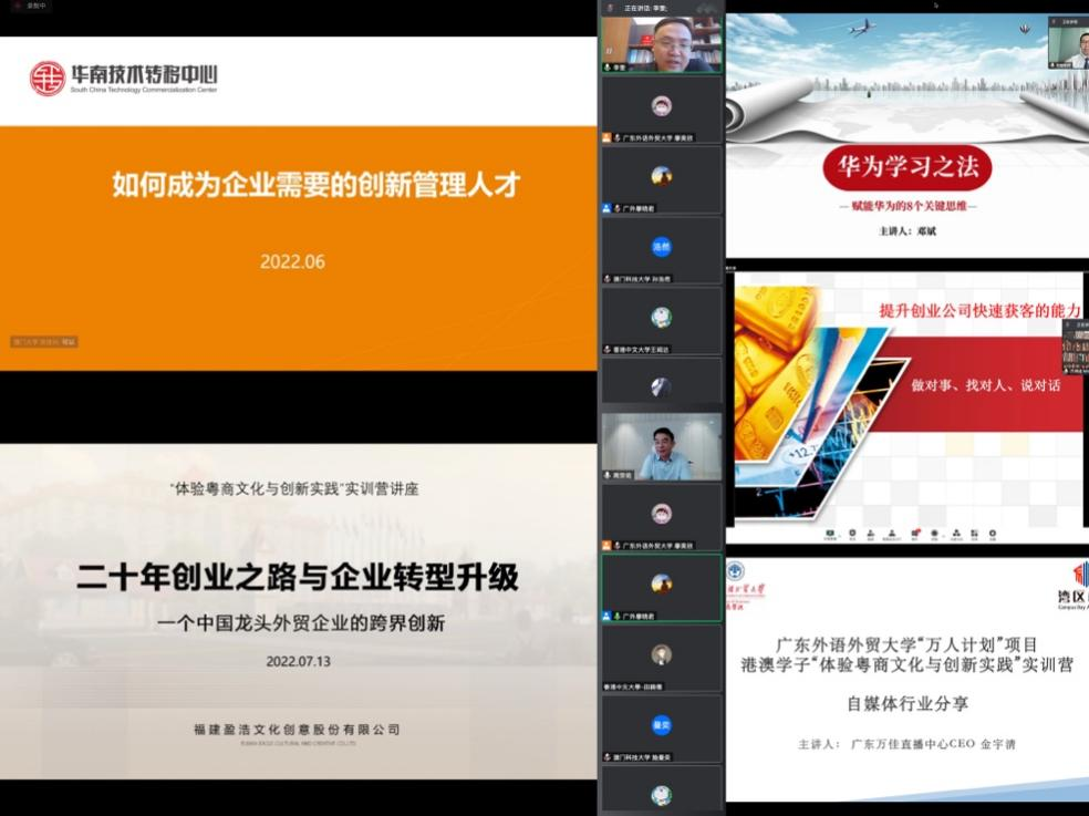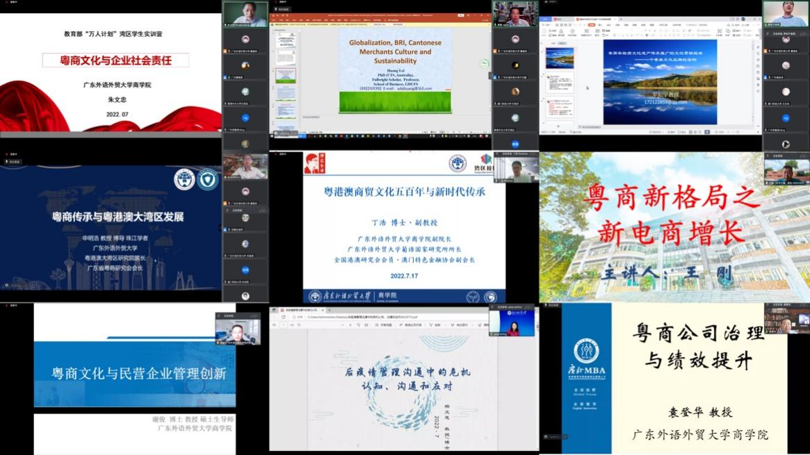 2022年7月7日至16日,历时10天的“‘古港新韵’湾区商贸文化的新时代传承实践研修班”顺利结业。此次研修班获2022年教育部“万人计划”立项,由广东外语外贸大学商学院承办,来自香港、澳门、广州、深圳四个湾区中心城市的70余名同学参加研修。研修班除专题授课外,还设计了录(直)播的实践讲解,并通过分组讨论的方式以使得研修形式多样、研修成果丰富。相关活动获人民网和《澳门日报》等媒体报道。、