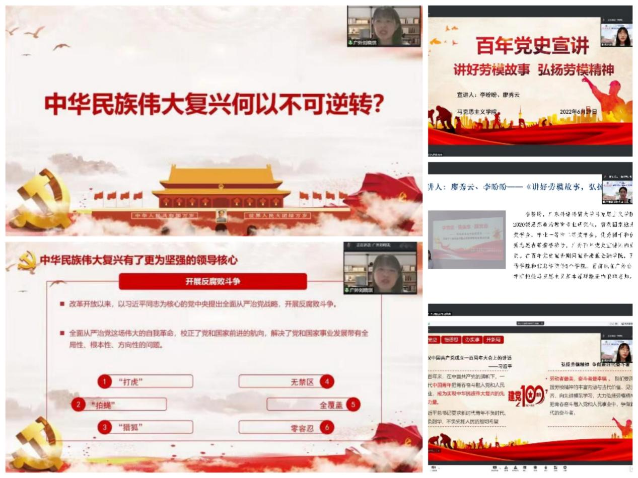 修学营举办期间,广外百年党史大学生宣讲团成员走进课堂开展线上党史宣讲,为学员们呈现了一场精彩生动的党史学习教育课。宣讲中,生动形象的图片视频和学习材料让学员们进一步夯实了自身的党史理论知识,更加坚定了理想信念,激励自己成为有担当、有作为的时代新人。