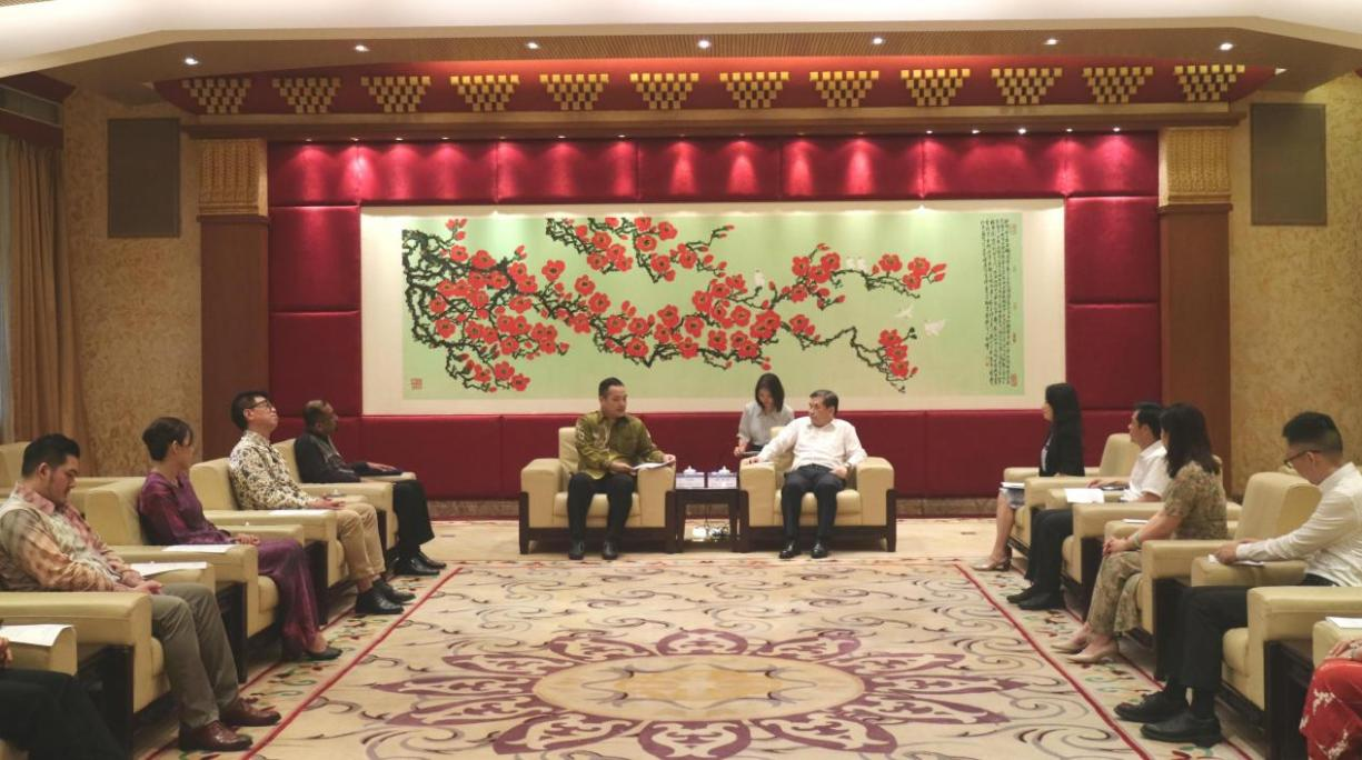 On the afternoon of June 16th, Beh Ching Chye, Consul General of Malaysia in Guangzhou, visited GDUFS. Jiao Fangtai, Vice President of GDUFS, met the guests at the VIP Reception Hall of the Administration Building of the North Campus. The two sides held a talk on the development of the Malay language program, the cultivating of foreign language talents, cooperation and exchanges.