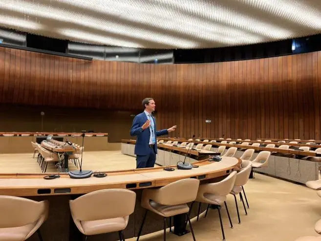 在Mr. Julian Caletti的带领下,同学们参观了万国宫内三间各具特色的会议室。国家间大大小小的议题都会在这些会议室里进行讨论、研究,这也使他们成为汇聚各国智慧的重要场所。